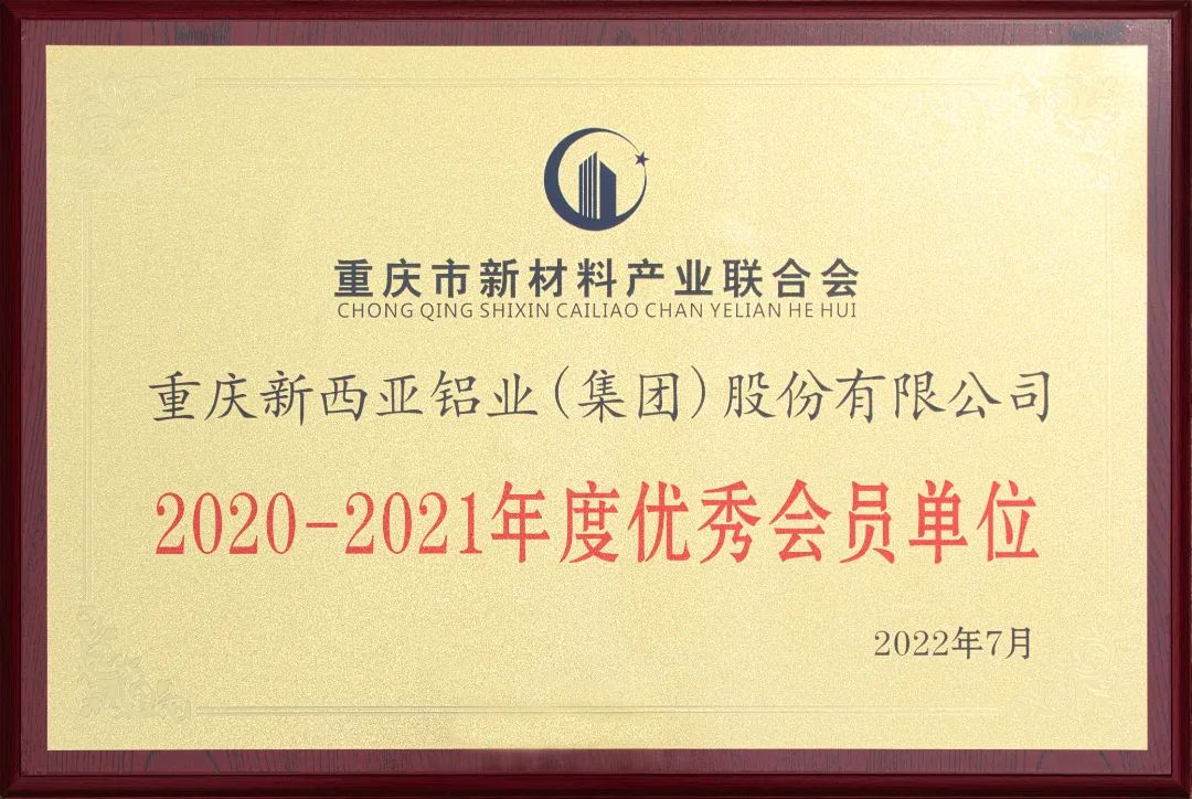 2020-2021年度,重慶新西亞鋁業(集團)股份有限公司在重慶市新材料產業聯合會的關心指導下,不忘初心、牢記使命,認真執行聯合會章程,履行副會長、會員義務,積極為新材料產業聯合會發展建言獻策。經重慶市新材料產業聯系會理事會研究,重慶新西亞鋁業(集團)股份有限公司被評為2020-2021年度優秀會員單位。