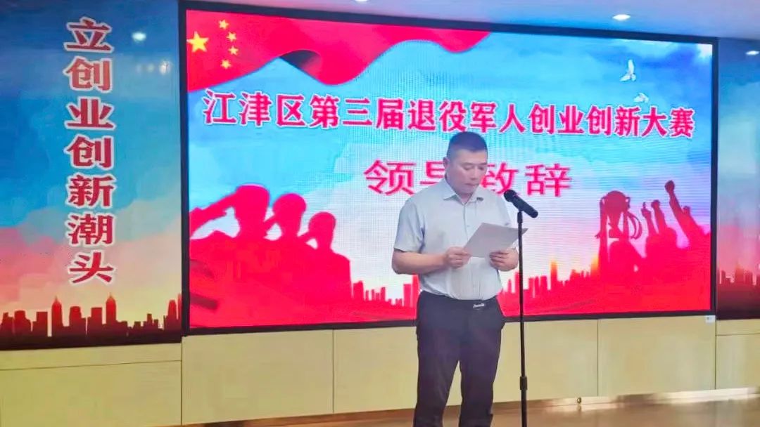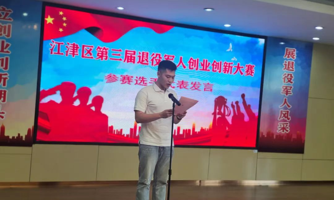 重慶市江津區未命名工作室的創始人劉雨曦作為參賽選手代表發言,他首先感謝區退役軍人事務局、人社局、多贏創嘉文化傳播有限公司為所有參賽者提供項目價值展示的平臺;感謝區退役軍人事務局、人社局對退役軍人創新創業工作的支持與關愛,希望所有參賽選手不辱使命,大膽發揮,賽出風格、賽出水平,以優異的成績回報區政府對退役軍人創業創新工作的支持與幫扶。