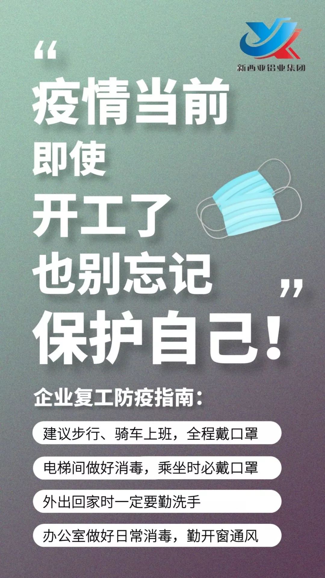重慶新西亞鋁業(yè)集團(tuán)積極遵循國(guó)家規(guī)定,響應(yīng)當(dāng)?shù)卣?hào)召,采購(gòu)了足夠的防護(hù)口罩、消毒液、體溫測(cè)量槍等疫情防控物資,并在此莊重承諾:公司復(fù)工后,我們將嚴(yán)格執(zhí)行制定的各項(xiàng)疫情防控管理制度,落實(shí)管控措施,確保集團(tuán)公司每一位員工的生命安全,保持公司生產(chǎn)經(jīng)營(yíng)工作持續(xù)、健康發(fā)展。