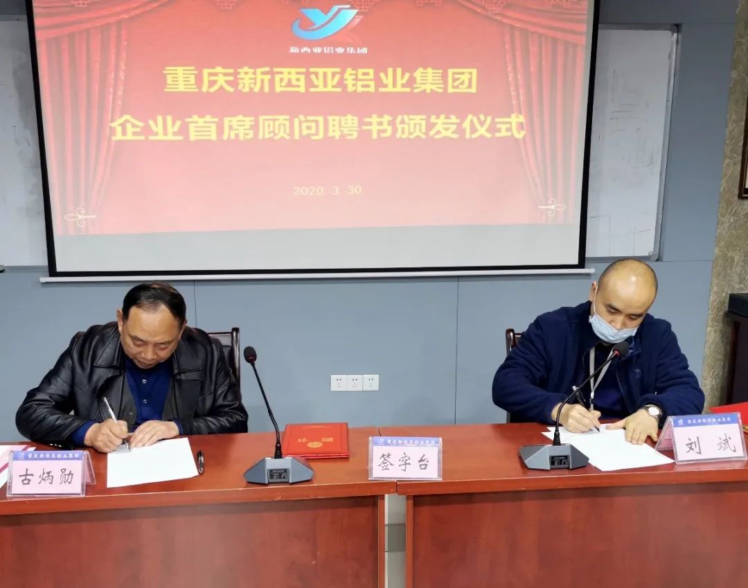 3月30日,重慶新西亞鋁業(集團)股份有限公司企業首席顧問聘任儀式在公司舉行??偨浝韯⒈髤⒓訒h,向新聘企業首席顧問古炳勛先生頒發了聘書,并作了重要講話。