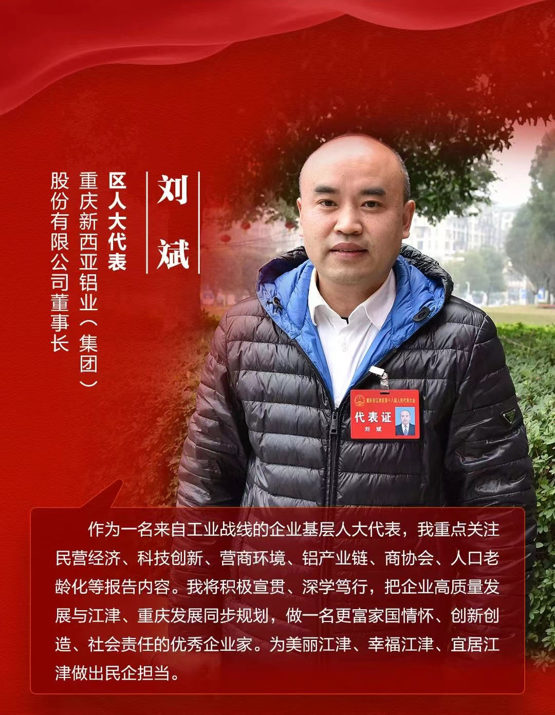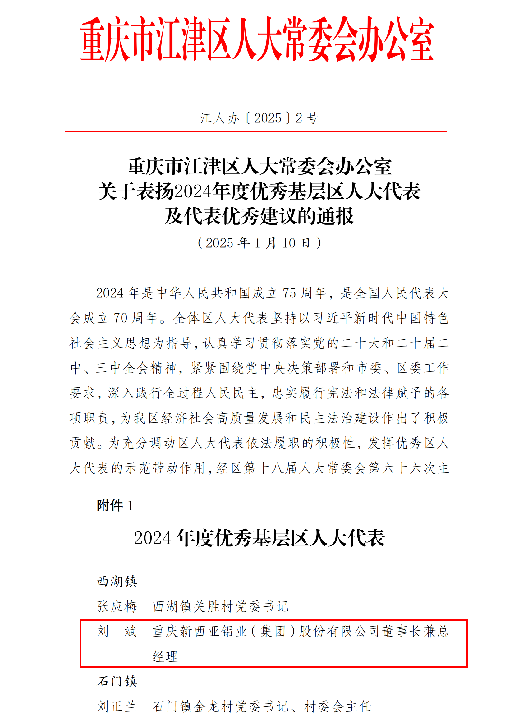 2025年1月10日,重慶市江津區人大常委會辦公室印發了《關于表揚2024年度優秀基層區人大代表及代表優秀建議的通報》,其中,重慶新西亞鋁業集團的董事長兼總經理劉斌同志榮獲2024年度優秀基層區人大代表的稱號。
