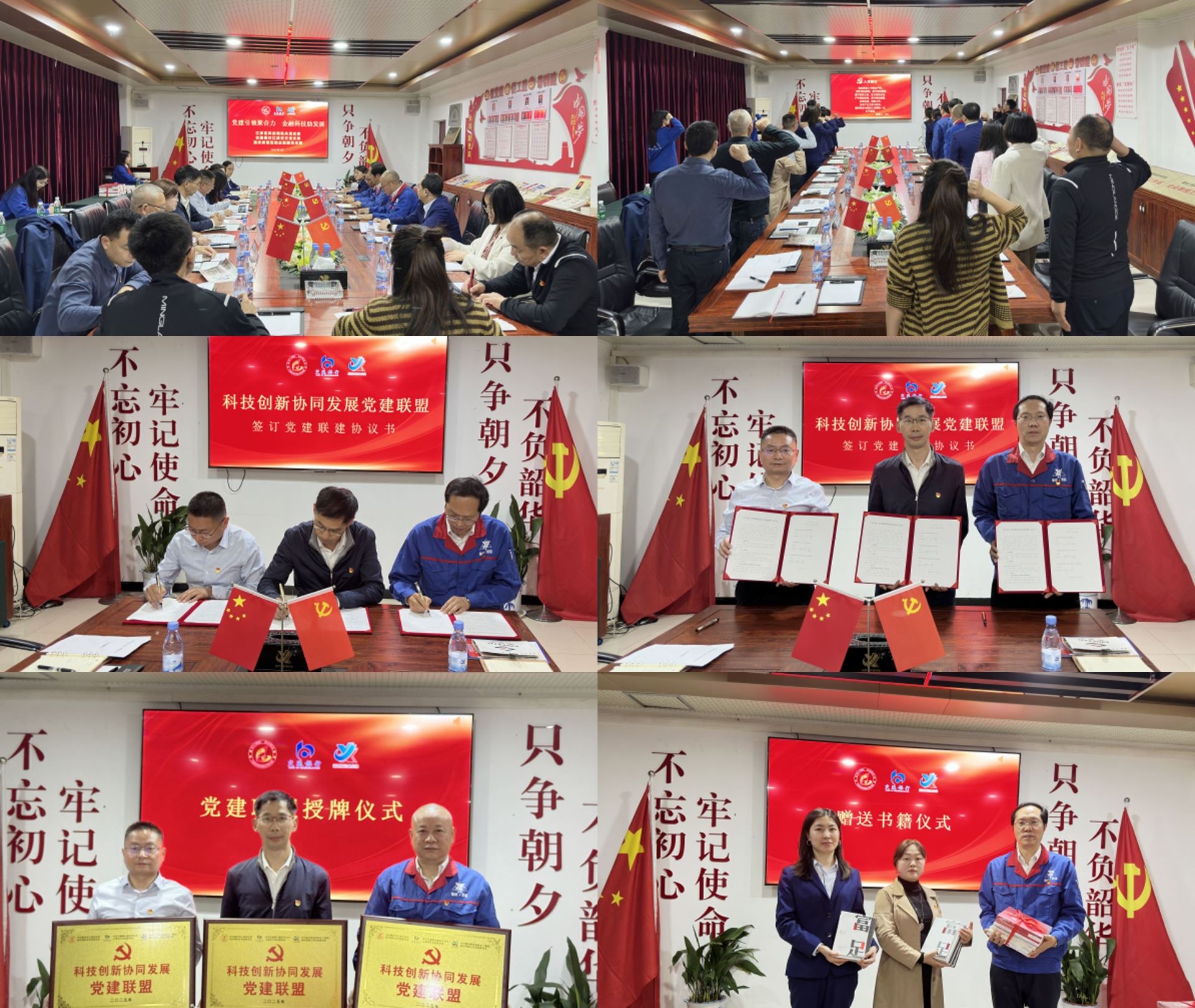 隨后,三方人員在二樓黨群活動(dòng)室舉行黨建交流座談會(huì)。會(huì)上,全體黨員重溫入黨誓詞,表達(dá)了為共產(chǎn)主義事業(yè)奮斗終身的堅(jiān)定決心。緊接著,舉行了莊重的“科技創(chuàng)新協(xié)同發(fā)展黨建聯(lián)盟”協(xié)議簽訂儀式和授牌儀式,標(biāo)志著三方正式結(jié)成黨建聯(lián)盟,開啟了黨建引領(lǐng)科技創(chuàng)新和金融服務(wù)的新篇章。授牌儀式后,三方互贈(zèng)了黨建、科技、金融、經(jīng)營(yíng)相關(guān)的書籍,以促進(jìn)學(xué)習(xí)交流,共同提升。