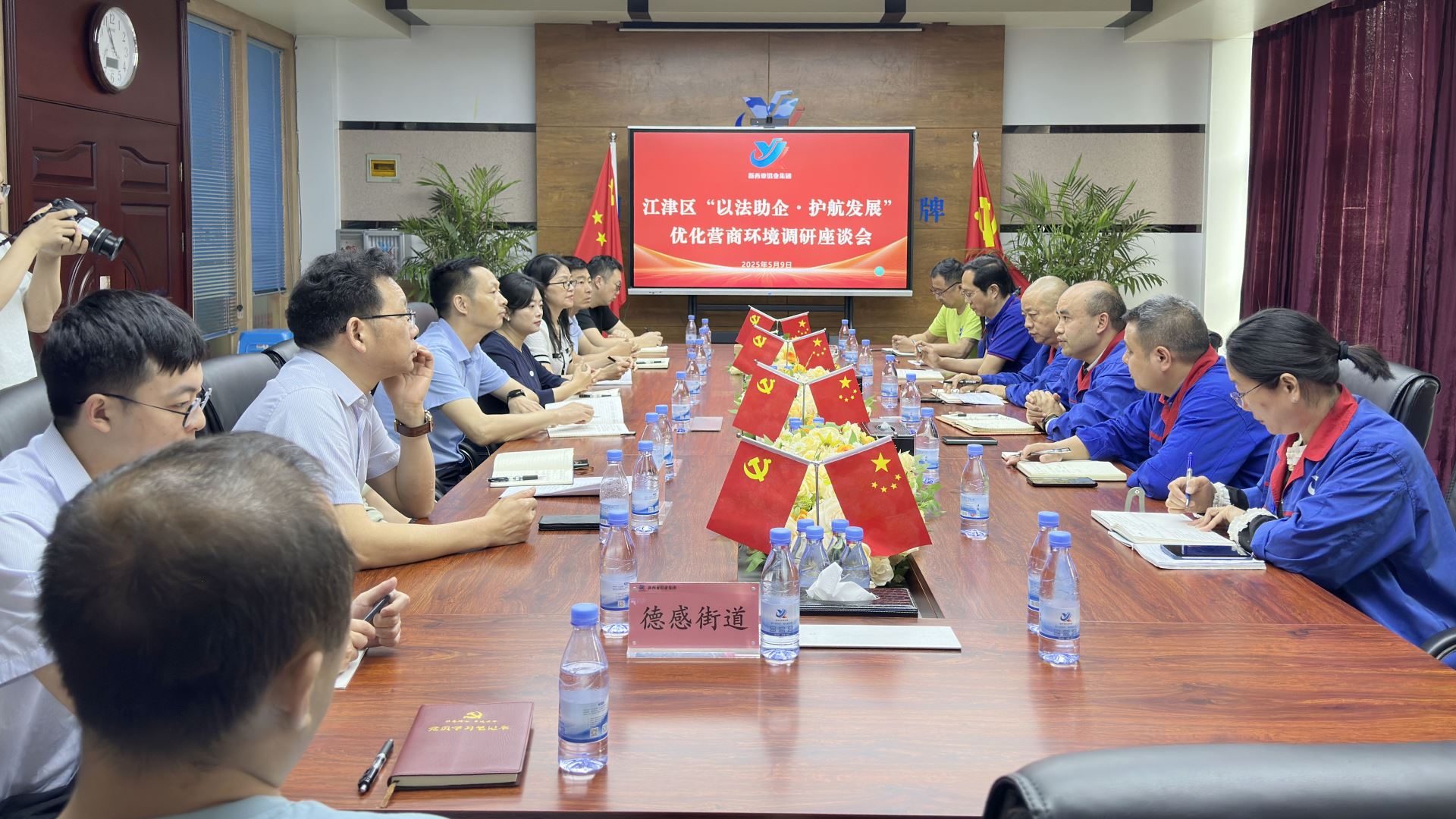 隨后,雙方在一樓多功能廳進行了深入的座談交流。董事長兼總經理劉斌首先對江津區委政法委委員、區法學會常務副會長陳祖平一行表示熱烈歡迎和誠摯感謝,他表示調研團隊的到來體現了各級黨委、政府對優化營商環境的重視以及對民營企業健康發展的關心。各事業部負責人提出了公司在依法經營、知識產權保護、財務稅務、勞動用工、合同管理等方面存在的問題和困難,企業方面共提出涵蓋知識產權保護、稅務籌劃等 15 類問題,涉及合同管理、勞動用工等多領域。