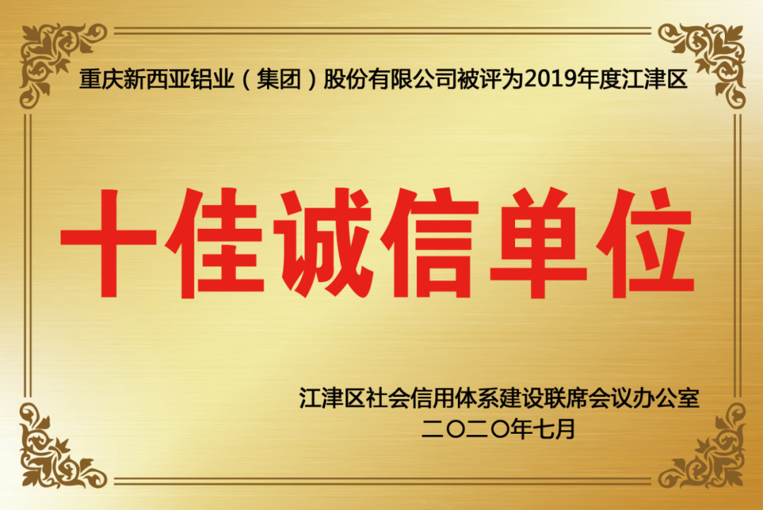 為樹(shù)立誠(chéng)信典型,營(yíng)造誠(chéng)實(shí)守信的社會(huì)環(huán)境,7月30日,江津區(qū)十佳誠(chéng)信典型案例現(xiàn)場(chǎng)發(fā)布會(huì)在時(shí)代廣場(chǎng)舉行。發(fā)布會(huì)上江津區(qū)副區(qū)長(zhǎng)唐大軍發(fā)表了重要講話(huà),區(qū)宣傳部長(zhǎng)秦敏為受表彰個(gè)人與企業(yè)進(jìn)行了授牌。重慶新西亞鋁業(yè)(集團(tuán))股份有限公司獲評(píng)“十佳誠(chéng)信典型案例誠(chéng)信單位”,劉斌總經(jīng)理率隊(duì)出席了會(huì)議。