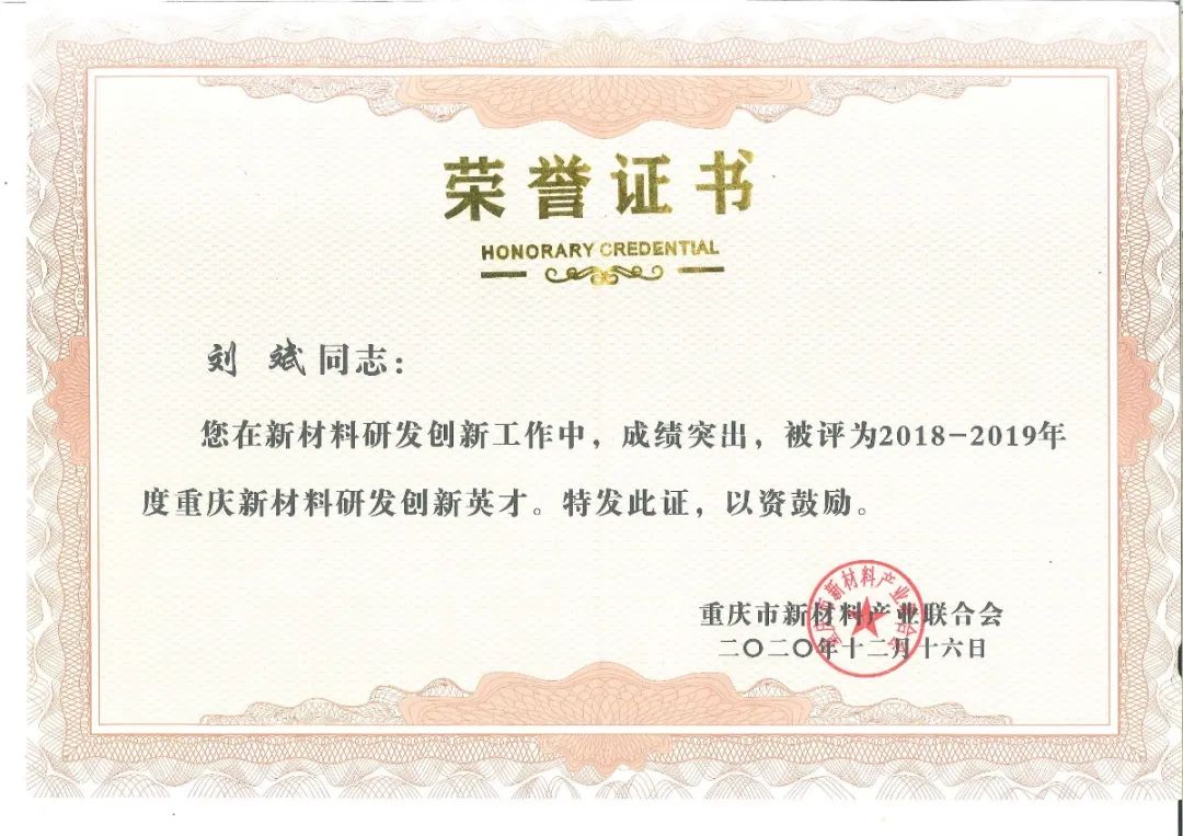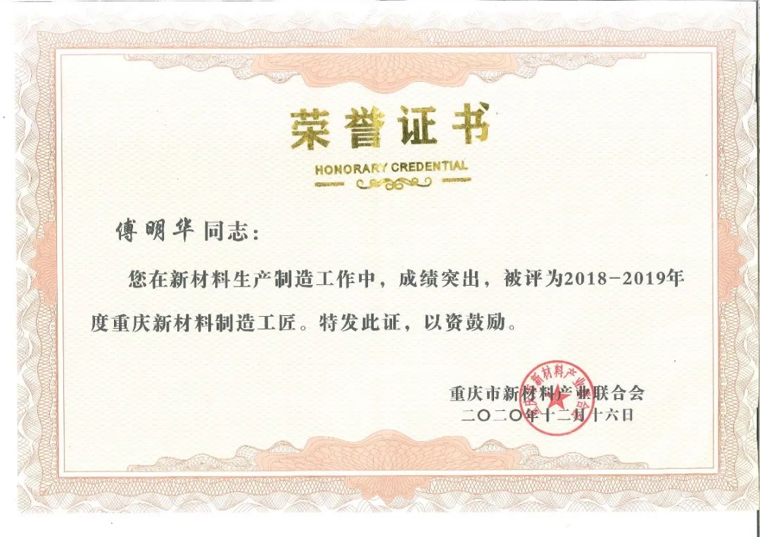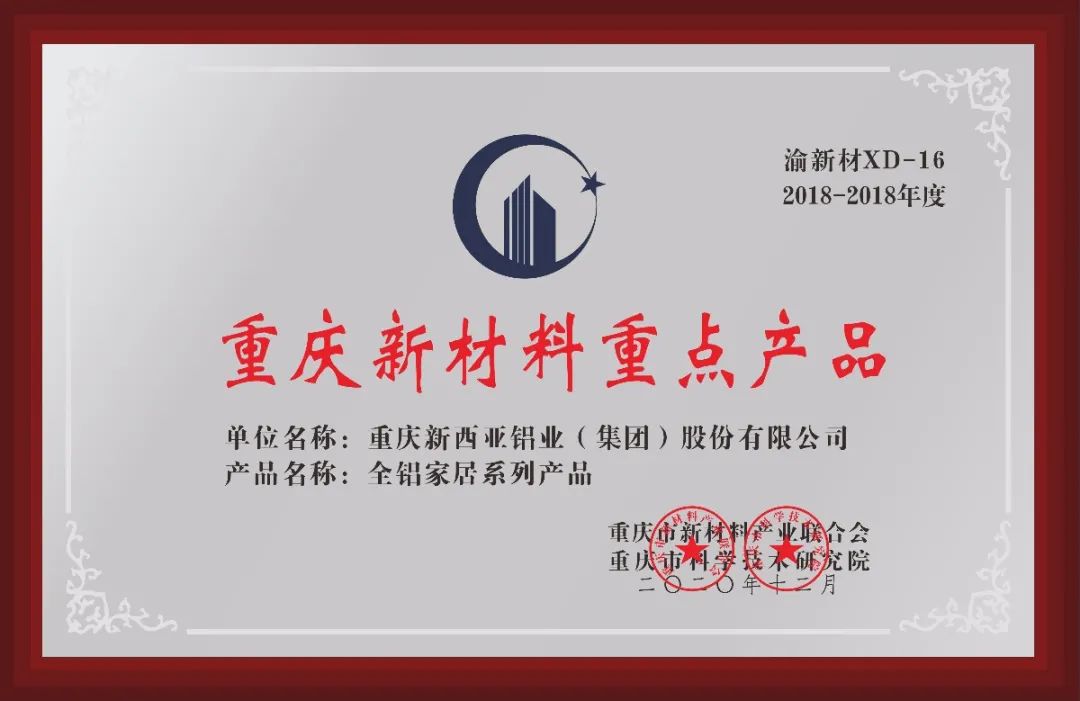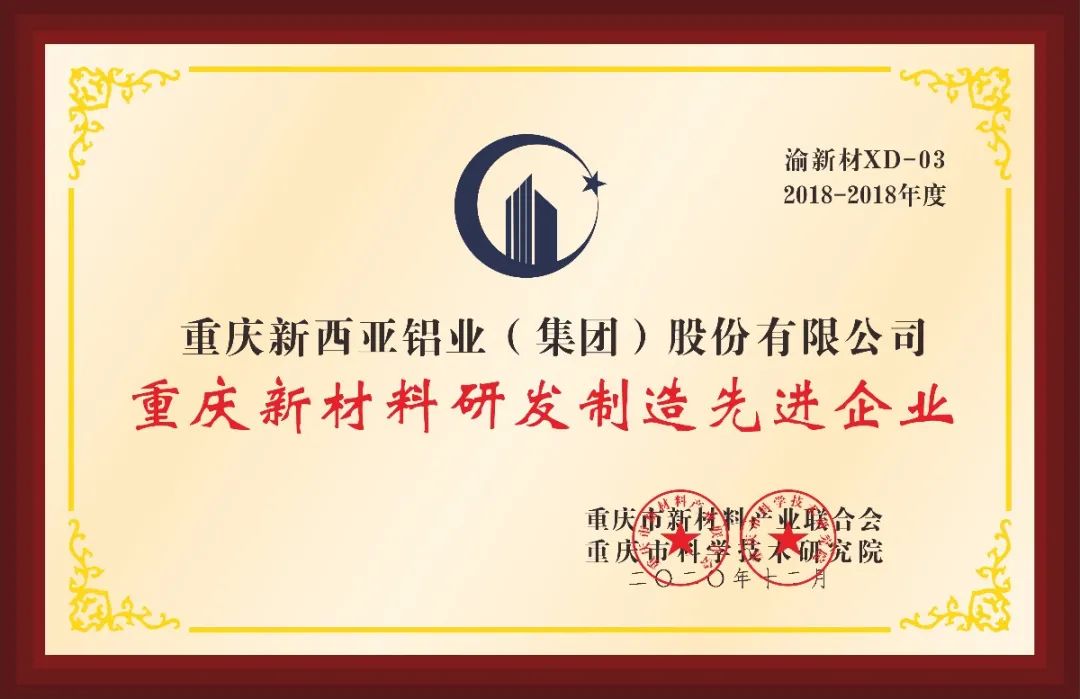 重慶新西亞鋁業(yè)集團榮獲2018-2019年度“重慶新材料研發(fā)制造先進企業(yè)”“重慶新材料重點產(chǎn)品”,集團公司總經(jīng)理劉斌榮獲“重慶市新材料研發(fā)創(chuàng)新英才”,鋁裝飾事業(yè)部執(zhí)行總經(jīng)理傅明華、生產(chǎn)部主管傅熊榮獲“新材料制造工匠”。