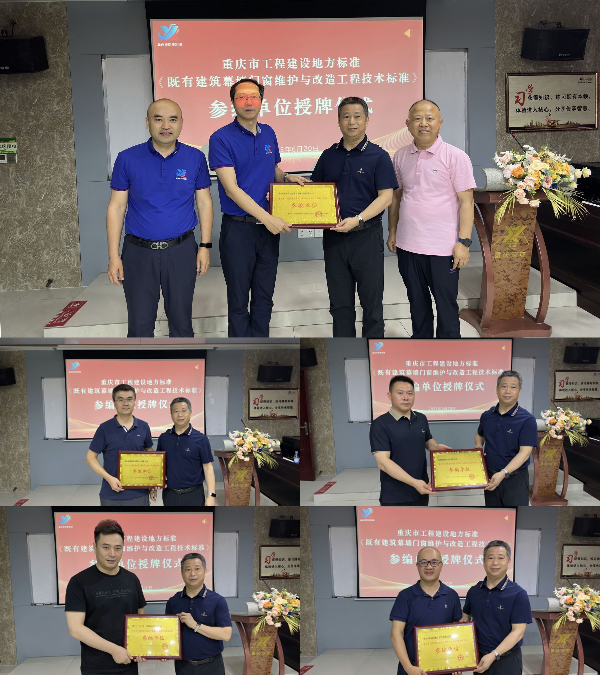 緊接著,重慶市《既有建筑幕墻門窗維護與改造工程技術標準》編制組負責人劉建、王勤向新西亞鋁業、重慶西南鋁建設工程有限責任公司、曜之巖(廣州)建材科技有限公司等多家參編單位授牌。此環節標志著各參編單位將共同承擔起該地方標準編制的責任。